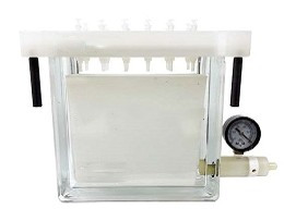 整套裝置含有一個透明玻璃槽和頂蓋,可通過抽真空控制樣品流過SPE小柱實現萃取程序。通過調整玻璃槽里面的支架可容納不同規格的樣品收集管,包括玻璃或塑料試管((SBEQ-CR9005,SBEQ-CR9012)、自動樣品瓶、容量瓶以及錐形瓶等,洗脫液通過聚丙烯(PP)或不銹鋼導向針以及防交叉污染的特氟隆(Teflon)連接管直接引入樣品收集管。配套的干燥裝置可直接導入空氣或氮氣至收集管吹干洗脫液以進行下一步分析。干燥裝置也可通過連接頭與SPE小柱連接,在后一步洗脫前吹干小柱內殘留的溶劑。12位裝置附贈一個聚丙烯(PP)廢液槽,用于操作中收集廢液,可簡化樣品處理過程中廢液的處理以及保持玻璃槽內潔凈的環境